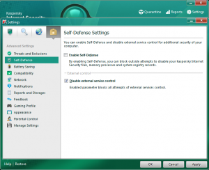 1. Buka Kaspersky Kemudian click setting, pilih icon paling kanan warna coklat, kemudian pilih self defense, Unchecklist Enable Self Defense nya